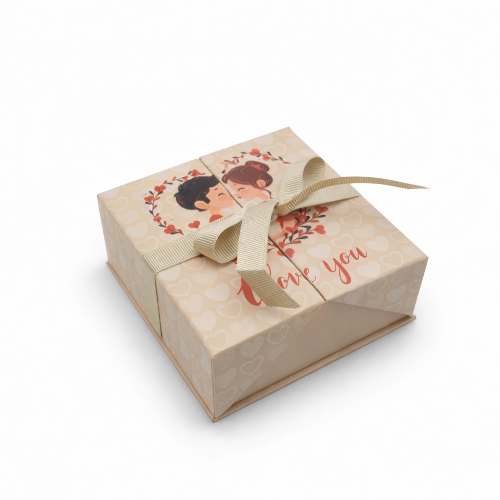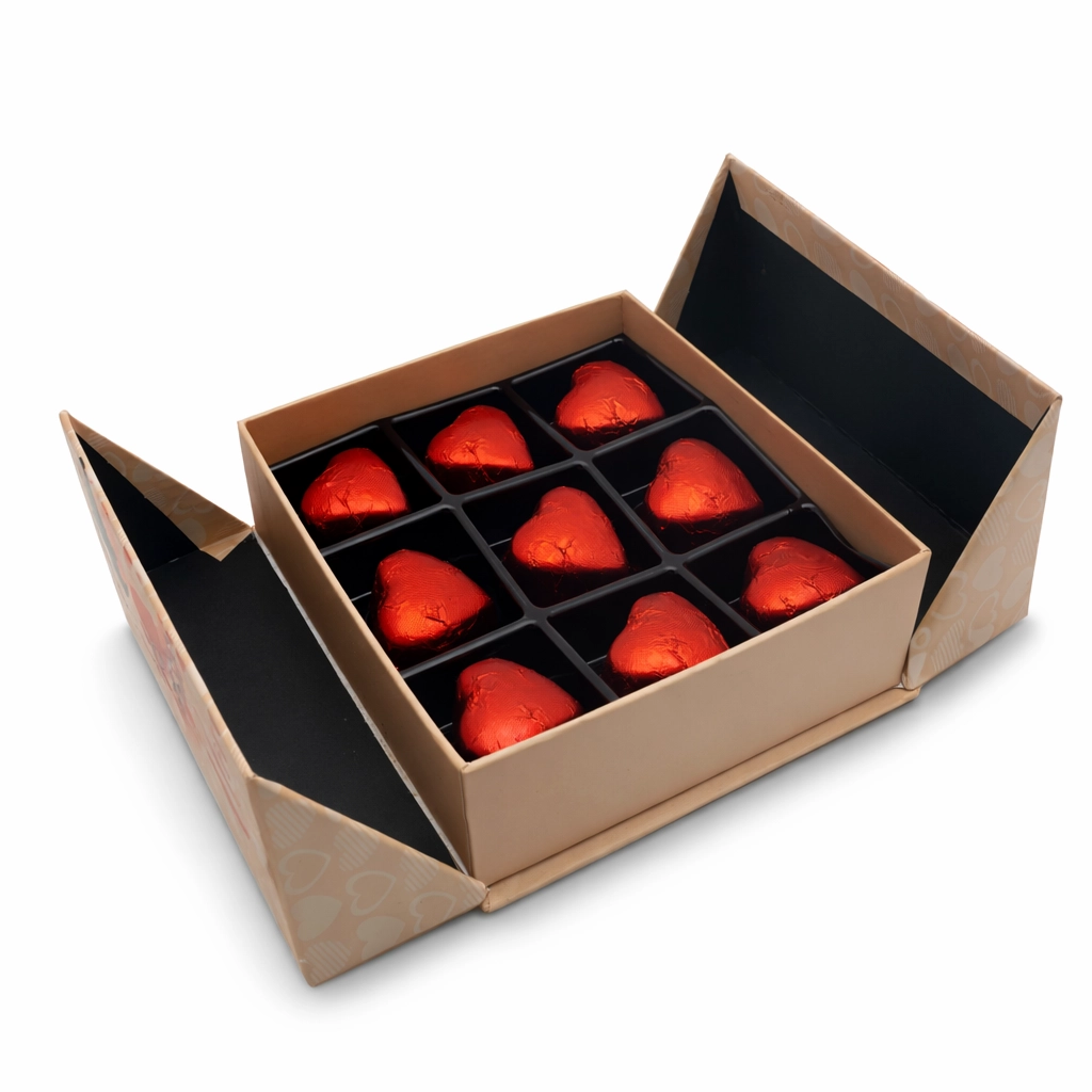 Kutunun içinde yer alan kırmızı sargılı kalpli çikolatalar, Sevgililer Günü’nün romantik ruhunu tamamlayan şık ve anlamlı bir detaydır ❤️ Hem göze hem damağa hitap eden bu özel dokunuş, sevginizi kelimelere gerek kalmadan anlatır.