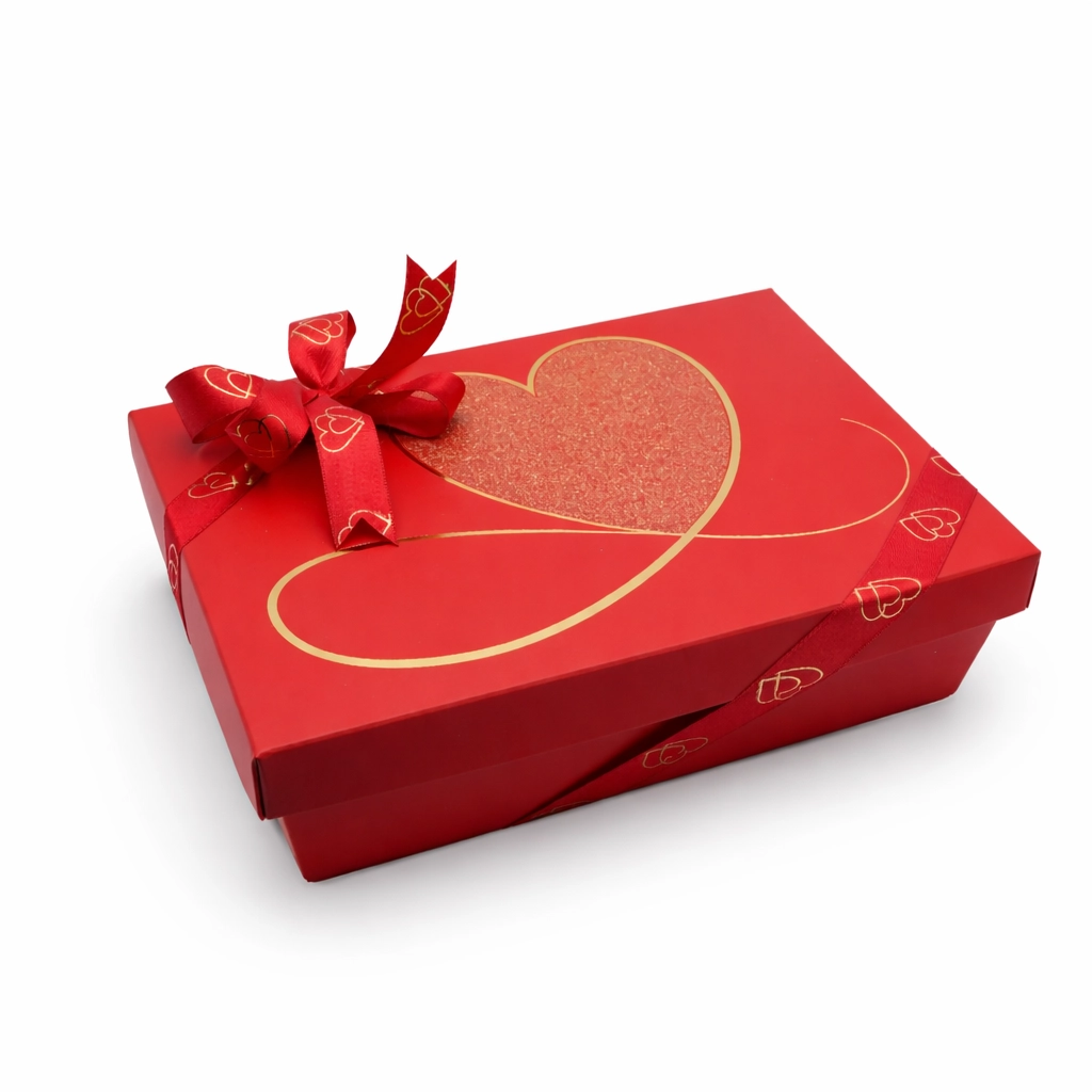 Kutunun içinde yer alan kırmızı sargılı kalpli çikolatalar, Sevgililer Günü’nün romantik ruhunu tamamlayan şık ve anlamlı bir detaydır ❤️ Hem göze hem damağa hitap eden bu özel dokunuş, sevginizi kelimelere gerek kalmadan anlatır.