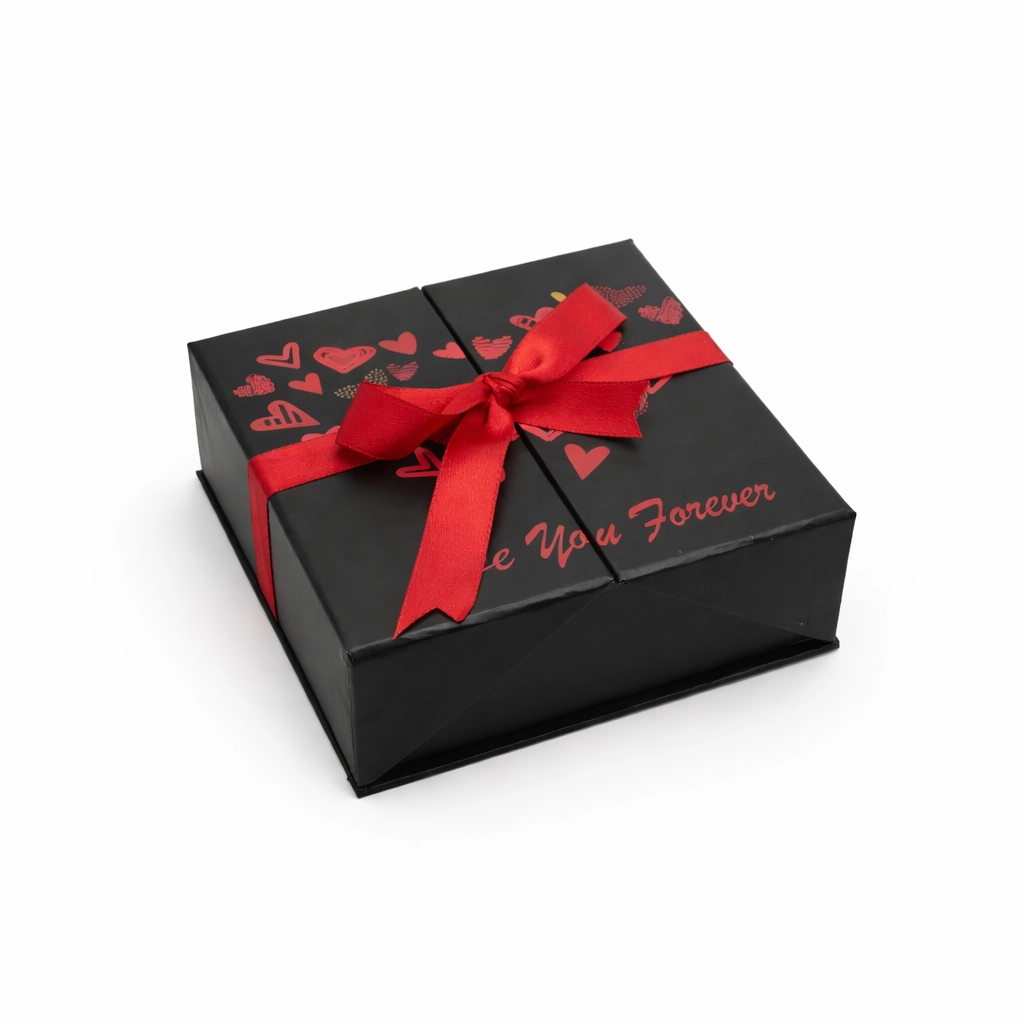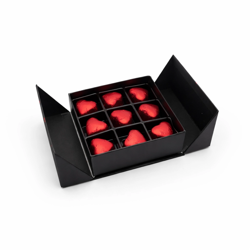 Kutunun içinde yer alan kırmızı sargılı kalpli çikolatalar, Sevgililer Günü’nün romantik ruhunu tamamlayan şık ve anlamlı bir detaydır ❤️ Hem göze hem damağa hitap eden bu özel dokunuş, sevginizi kelimelere gerek kalmadan anlatır.